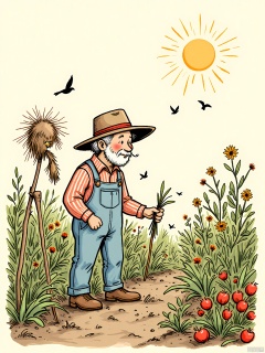 ETHB, A charming, linocut print in a rustic, folk art style. A farmer with a wide-brimmed hat and overalls tends to his garden, filled with rows of vegetables and flowers. A friendly scarecrow stands guard in the corner, and a flock of birds flies overhead. The sun shines brightly, and the farmer's face is weathered but kind. The background is a simple, earthy brown, representing the soil and the hard work of farming. The mood is one of contentment and simplicity.