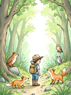 ETHB, A charming, watercolor and ink illustration in a gentle, storybook style. A young boy with a backpack and a wide-brimmed hat explores a magical forest, filled with talking animals and strange creatures. He follows a path of glowing stones, and along the way, he meets a friendly fox, a wise old owl, and a mischievous squirrel. The forest is filled with vibrant colors and hidden wonders, and the boy's eyes are wide with excitement. The background is a soft, dappled green, representing the lushness of the forest. The scene is one of adventure and discovery, capturing the magic of childhood exploration.