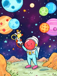 ETHB, A lively, digital illustration in a vibrant, cartoonish style. A group of friendly aliens with colorful skin and big, googly eyes zoom through space on jetpacks. They wear matching space helmets and carry ray guns, exploring a galaxy filled with swirling nebulae and twinkling stars. One alien points excitedly at a passing comet, while another laughs joyfully. The backdrop is a deep, inky black, filled with distant galaxies. The mood is one of pure, unbridled fun and adventure.