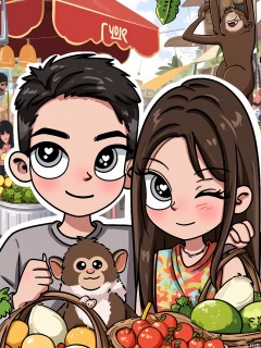WKX, Anime-style illustration of a couple shopping together in a bustling market, with baskets in hand and smiles on their faces. The man has a friendly, approachable look with short, black hair, and the woman has long, curly hair with a colorful scarf. Both have curious eyes and are examining fruits and vegetables. A small, mischievous monkey with a tail swings from a stall, trying to grab their attention. The background is a vibrant, colorful market with stalls filled with goods and people bustling around. The overall style is lively and cultural.
