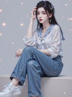 1girl, solo, long hair, looking at viewer, blue eyes, brown hair, shirt, black hair, bow, jewelry, sitting, closed mouth, school uniform, full body, white shirt, earrings, shoes, pants, sailor collar, necklace, lips, head tilt, makeup, white footwear, denim, sneakers, jeans, realistic, blue pants, red lips, no socks