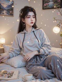 The white wooden bedside table next to the bed is placed with some small objects with a strong sense of life. A white glass table lamp with a unique shape, the lamp post is spiral, the lampshade is hemispherical, and the light emits a soft warm yellow light from the lampshade, which evenly sprinkles on the girl's face, outlining every detail of her face, making her face look softer in the interweaving of light and shadow. There was a cup of steaming herbal tea next to the desk lamp. The tea cup was made of transparent glass. Through the cup, you could see the colorful flowers and plants inside, including golden lemon slices, bright red rose petals, and green mint leaves. They stretched and rolled in the hot water, emitting a fresh and pleasant fragrance, blending with the faint body fragrance of the girl, and permeating the entire room. There is also a fashion magazine with a simple cover design. The pages opened by the magazine show the popular outfits and tourist attractions of the season. Girls occasionally read in their spare time to draw inspiration and enrich their lives.