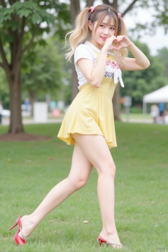 : "1girl,black red hair,yellow dress, school_uniform, miniskirt,t_shirt