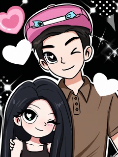 WKX, Cartoon-style digital drawing of a cute couple, a man and a woman, both with large, expressive eyes and black hair. The man has a friendly smile and wears a brown polo shirt. The woman is winking with a playful expression, wearing a black sleeveless top. The background features a heart shape with pink and white colors, surrounded by small pink cartoon characters and sparkling effects. The overall style is whimsical and cute, with a playful and romantic vibe.
