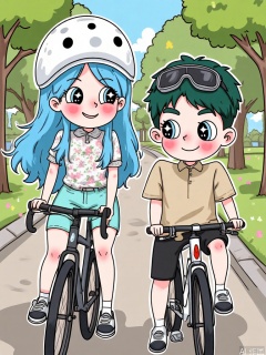 XDGZ, Digital drawing of a cute anime couple, a boy and a girl, riding bicycles together in a park. The girl has long, sky blue hair with a helmet, happy eyes, and is wearing a cycling jersey with shorts. The boy has short forest green hair, carefree eyes, and is wearing a biking outfit with goggles. Both have blushing cheeks and are smiling as they ride. The background is a park with trees and a bike path, in shades of greens and blues. The art style is active and outdoorsy, with a soft, pastel color palette.