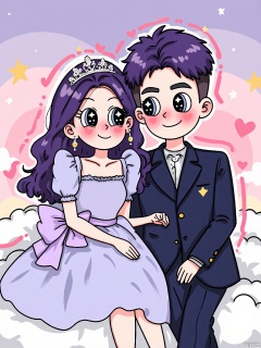 XDGZ, Digital drawing of a cute anime couple, a boy and a girl, sitting side by side on a fluffy cloud. The girl has long, curly purple hair with a silver tiara, big sparkling eyes, and is wearing a lavender dress with a moon pendant. The boy has spiky blue hair, bright eyes, and is wearing a navy blue suit with a star pin. Both have blushing cheeks and are holding hands. The background is a dreamy sky with soft pink and purple hues, filled with tiny stars and floating hearts. The art style is whimsical and enchanting, with a pastel color palette.