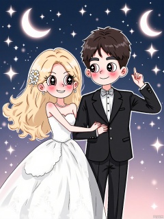 XDGZ, Digital drawing of a cute anime couple, a boy and a girl, dancing under a starry night sky. The girl has long, straight blonde hair with a daisy hairpin, wide innocent eyes, and is wearing a white lace dress with a pearl necklace. The boy has short black hair, intense eyes, and is wearing a black tuxedo with a silver bowtie. Both have rosy cheeks and are twirling around gracefully. The background is a night sky with a crescent moon and twinkling stars, with a soft gradient of blues and purples. The art style is romantic and ethereal, with a soft, pastel color palette.
