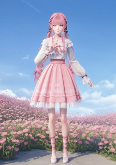 score_10,score_9,score_8_up,score_7_up,1girl,<lora:NikkiDefault_PonyV1-000004:0.5>,NikkiDefault,solo,smile,shirt,skirt,ribbon,twintails,standing,braid,choker,pink hair,long hair,pink skirt,full body,white footwear,long sleeves,hair ribbon,pink eyes,in summer,day,nature,flower field,outdoors,sky,Cirrocumulus,looking at viewer,