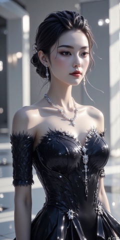 Asian models wore off-shoulder black evening dress and wore platinum necklace. The soft-light studio highlighted the luster of the collarbone and diamonds. The pearl earrings and necklace form a material contrast, and the mirror floor reflects the overall shape.