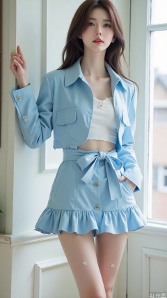 WALLPER is a medium angle photo,featuring fair skin,skin that glows white, and an extreme lighting effect. The side backlight and front side warm light work together to show her perfect figure. She wore a light blue short trench coat with a slim fit design, with a single-breasted open, revealing the white short trench vest inside, showing her proud chest and slender waist, and the neckline and cuffs are decorated with white fluff to add a sweet feeling. The lower body is paired with a light blue high-waisted short skirt. The short skirt is in an A-line style. The hem has multiple layers of ruffles and is longer than the middle of the thigh, showing slender and beautiful legs. She was wearing flesh-colored stockings on her beautiful legs, and there were light blue stars on her stockings. She sports a pair of light blue high heels, with a 10 cm heel and a white bow on the upper, which exudes a fresh and sexy charm under the sunlight. She held the window with her hands and raised her head slightly, her eyes bright and charming, which was heart-warming.