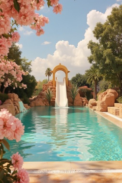 rich,<lora:rich15:0.8>,Pool core,flower,outdoors,sky,day,no humans,pool,cloud,slide,water,tree,blue sky,rain,dreamlike,huge filesize,incredibly absurdres,Cinematic Lighting,