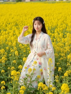 In the golden rapeseed flowers, a beautiful woman walked out like a painting. Her skin is like jade and pink, her eyes are bright, her eyebrows are like willow leaves, and her cherry lips are smiling. The long hair is intertwined with flowers, wearing a floral skirt, the corners of the skirt are flying, and the flowers are blending together, showing the beauty of spring.