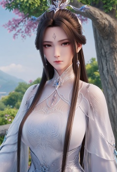 score_9,1girl,solo,forehead mark,large_breasts,black eyes,earrings,dress,white dress,hair bun,hair ornament,long hair,brown hair,chinese clothes,long sleeves,closed mouth,looking_at_viewer,upper body,<lora:QQSponyluxueqiV2:0.8>,<lora:Pony_DetailV2.0:0.8>,<lora:皮肤凹痕:0.1>,