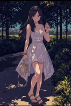1girl, solo, long hair, black hair, dress, holding, jewelry, standing, full body, bag, white dress, bracelet, sandals, watch, handbag, wristwatch, fashion,Shoes