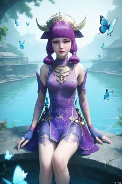 1girl, solo, hair ornament, gloves, dress, twintails, sitting, purple hair, horns, fingerless gloves, water, bug, butterfly, purple dress