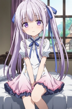 1girl, solo ,long hair, blush, ribbon twintails, purple eyes, hair ribbon, purple hair ,White dress,(Pink layered skirt:1.3),on the bed,Indoor,Window,Village,Sunshine,,shock:,blush,tear,(slim:1.5),(skinny:1.2),Thin legs,sit,One leg up, one leg down,between legs