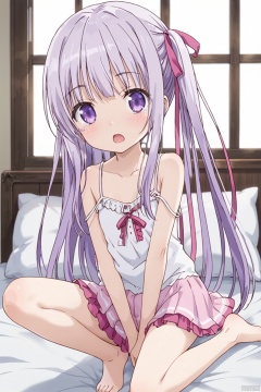 1girl, solo ,long hair, blush, ribbon twintails, purple eyes, hair ribbon, purple hair ,White dress,(Pink layered skirt:1.3),on the bed,Indoor,Window,Village,Sunshine,,shock:,blush,tear,(slim:1.5),(skinny:1.2),Thin legs,sit,One leg up, one leg down,between legs,bare feet,open the mouth,loli,camisole