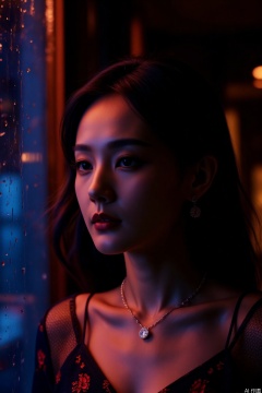 Under the soft indoor lighting, the elegant woman's face is painted with light and shadow. Sony A7R4 camera, aperture f/4, shutter speed 1/60 second, ISO 400. The colors are rich, with a cool tone, creating a tranquil atmosphere.,rainy night,vivid color,necklace