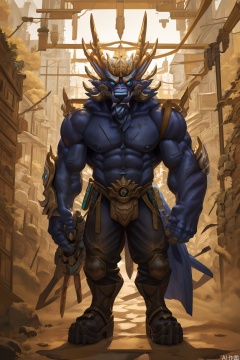 solo, character:warwick, 1boy, holding, standing, full body, cigarette, steampunk, pocket watch store, gear, copper rust, male focus, boots, holding cigarette, armor, muscular, facial hair, holding sword, eyepatch, pectorals, muscular male, shoulder armor, smoke, dual wielding