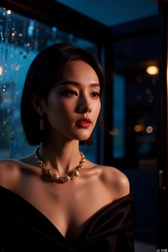 Under the soft indoor lighting, the elegant woman's face is painted with light and shadow. Sony A7R4 camera, aperture f/4, shutter speed 1/60 second, ISO 400. The colors are rich, with a cool tone, creating a tranquil atmosphere.,rainy night,vivid color,necklace
