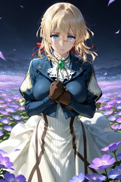 1girl,blonde hair,flower,blue coat,white dress,solo,gorgeous picture,blue eyes,head,looking at viewer,ray tracing,photorealistic,Detailed beautiful delicate face,Cinematic Light,light source contrast,big eyes,front,huge breasts,1girl,curly hair,in the dark,deep shadow,medium hair,1face,1body,perfect face,perfect body,cover,despair,distinct,sobbing,violet evergarden,beautiful garden, flowers,