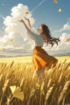1 girl, brown hair, wearing an orange skirt, face to the blue sky, eyes closed, smiling, surrounded by yellow wheat fields, yellow ginkgo floating in the sky, white clouds floating in the blue sky, cartoon style, high quality, high resolution, look up, three-ee point oint perspective, the deep knee