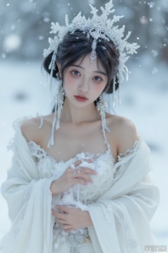 world full of snow,realistic,face photo,18 years old very thin girl,skin tight,very white skin, nudes ,very snowy,white ice on skin,many snow in hands,hands in front of breasts,cinematic lighting, soft focus,35mm film