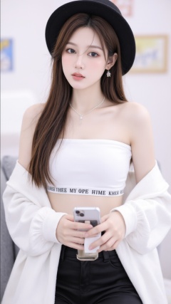 A young girl appears solo in the frame,adorned with jewelry including a necklace and earrings. She is wearing a white bra,black pantyhose,and is standing,not sitting. Her long hair cascades down her back,and she holds a cellphone in her hand,presenting a realistic image. She is dressed in an open shirt with off-the-shoulder long sleeves,revealing a hint of cleavage. The girl has brown hair,blue eyes,and is wearing black headwear. She gazes directly at the viewer with her lips closed,exuding an elegant and enigmatic aura.luo,luo,.,(The letters "HSY" are printed on the clothes:1.6, presented in a subtle manner:1.6, not too eye-catching, just clear enough to be identified. The color of the letters matches the overall picture.),