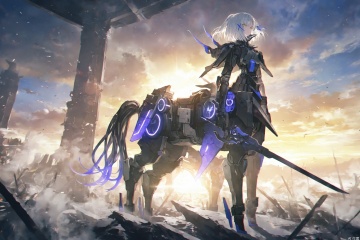 rosetta,1girl, solo, breasts, looking at viewer, short hair, holding, standing, full body, yellow eyes, weapon, white hair, multicolored hair, sword, holding weapon, armor, high heels, streaked hair, holding sword, science fiction, mecha musume, joints, taur, mechanical legs, centauroid,from above,
