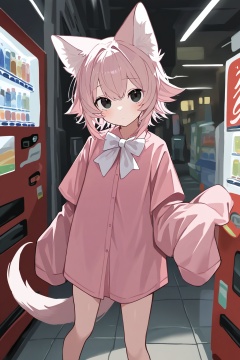 masterpiece, best quality, doremifaso64, 1girl, solo, looking at viewer, shirt, long sleeves, bow, animal ears, standing, tail, pink hair, indoors, bowtie, black eyes, sleeves past wrists, feet out of frame, white bow, sleeves past fingers, pink shirt, oversized clothes, vending machine,sketch,