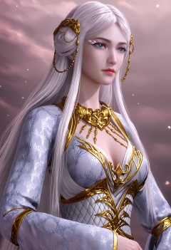 sscore_9,high detail,best quality,cinematic lighting,volumetric lighting,shiny skin,shiny,nsfw,1girl,solo,long hair,breasts,dress,white hair,cleavage,hair ornament,blue eyes,eyelashes,white dress,hair bun,realistic,makeup,jewelry,upper body,gold trim,medium breasts,long sleeves,necklace,wide sleeves,looking_at_viewer,<lora:QQSponybailongV1:0.8>,<lora:Pony_DetailV2.0:0.8>,<lora:皮肤凹痕:0.1>,