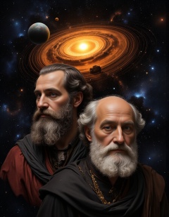 F1AlistdBolatu,A cosmic portrait of two historical figures,set against a backdrop that merges classical art with modern astronomy.,<lora:FLUX.阿里斯多德&柏拉图F1AlistdBolatu:1.1>,