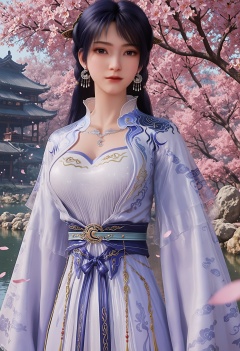 score_9,1girl,solo,breasts,jewelry,dress,earrings,black hair,realistic,long hair,white dress,long sleeves,upper body,sash,simple background,black eyes hair ornament,chinese clothes,looking_at_viewer,\nBREAK\nfair_skin,white_skin,shiny_skin,Ivory_skin,(looking at viewer:1.1),(cinematic lighting:0.9),(volumetric lighting:0.9),solo focus,(huge breasts:0.9),(perfect_face:1.2),(perfect_anatomy:1.1),Tranquil garden pond surrounded by cherry blossoms,Vibrant cherry blossom park in full bloom,day,suneate,<lora:QQSponyjiziyueV2:0.8>,<lora:Pony_DetailV2.0:0.8>,<lora:皮肤凹痕:0.1>,
