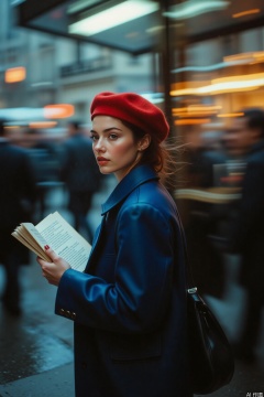 On the streets of New York under heavy rain, the ground is slippery and reflective. Vehicles speed by, splashing up numerous water flowers. The ceaseless flowing scene has a special sense of movement in the rain curtain. The street shop windows are brightly lit, and the neon lights create a hazy feasting and revelry scene in the rain. A woman wearing a red beret and a blue raincoat stands under the bus stop. She is looking intently into the distance, holding an open poetry collection in her hand, as if immersed in her own spiritual world. Shoot with an Olympus OM-D E-M1 Mark III camera, aperture f/3.2, shutter 1/80s, ISO 800. The overall picture presents a color tone of cold blue and warm red interwoven. New York in the rain and the woman form a poetic picture.