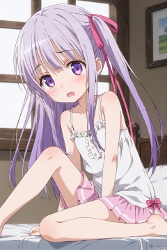 1girl, solo ,long hair, blush, ribbon twintails, purple eyes, hair ribbon, purple hair ,White dress,(Pink layered skirt:1.3),on the bed,Indoor,Window,Village,Sunshine,,shock:,blush,tear,(slim:1.5),(skinny:1.2),Thin legs,sit,One leg up, one leg down,between legs,bare feet,open the mouth,loli,camisole