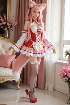 Realistic photo, one young woman, long hair, fair skin, big breasts, fox ears, fox tail, daji cosplay costume, stockings, long legs, high heels, full body, standing, luxury living room, flowers,