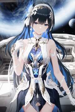 1girl, solo, long hair, breasts, looking at viewer, bangs, blue eyes, black hair, hair ornament, gloves, dress, bare shoulders, closed mouth, blue hair, flower, multicolored hair, cowboy shot, hairband, sleeveless, white gloves, two-tone hair, sleeveless dress, moon, colored inner hair, space, planet,selena