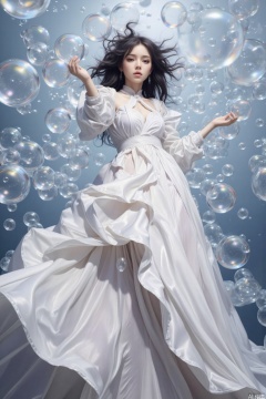 surrounded by bubbles,bubble, This girl has voluminous dark curly hair, a well-proportioned figure, and a soft face. She is wearing a white long dress with a complex and delicate design, featuring pleats and layered elements, making the overall look magnificent and artistic.