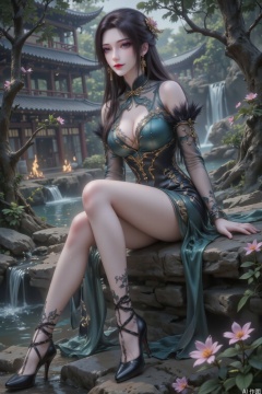 Color dress, big boobs, cleavage cut, crossed legs, fire, rock, tree
