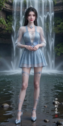 Chinese aesthetics, Full figure, perfect five fingers, high-definition details, skin texture, realistic background The succubus stood in front of an ancient waterfall, the water crashing against the rocks. She wore a light blue tulle skirt with patterns of water waves and waterfalls printed all over it. Her expression was quiet and mysterious, and her eyes were looking at the crystal ball in her hand. Her long hair flutters gently in the mist, contrasting with the light blue tulle skirt. Her figure is tall and straight, with graceful curves, like a fairy in a waterfall. The majesty of the waterfall forms a strong contrast with the beauty of the banshee, making people feel a shocking beauty.