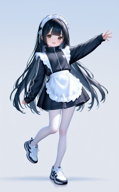 masterpiece,very aware,highres,absurdres,newest,best quality,high quality,loli,chromatic_aberration,Light Blue Theme,//,white_pantyhose,1girl, unconventional maid, solo, apron, long hair, pantyhose, jacket, full body, maid headdress, maid, white apron, white pantyhose, brown eyes, black hair, shoes, simple background, white background, frilled apron, white footwear, open mouth, long sleeves, maid apron, sneakers, looking at viewer, standing, standing on one leg, smile, track jacket, waist apron, blush, black jacket, breasts, frills, outstretched arm, blunt bangs, very long hair, alternate costume, sleeves past wrists//,year_2023,year_2024,buzhidao228 style,//,<lora:buzhidao228——【noob】hans:0.4>,