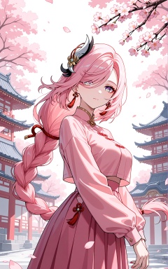 <lora:noobai_v-niji style-v2-000020:0.8>,niji style,enhance light and shadow,1girl,hair ornament,pink hair,shenhe (genshin impact),long hair,solo,cherry blossoms,outdoors,pink skirt,earrings,looking at viewer,jewelry,tassel,breasts,flower,tassel earrings,braid,hair over one eye,east asian architecture,large breasts,architecture,alternate costume,purple eyes,very long hair,petals,hair flower,pink theme,long sleeves,nail polish,closed mouth,pink shirt,braided ponytail,falling petals,blue eyes,floating hair,skirt,shirt,cowboy shot,