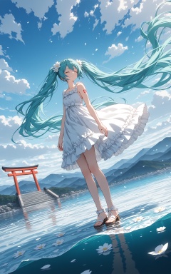 <lora:noobai_v-niji style-v2-000020:0.8>,niji style,enhance light and shadow,niji style,enhance light and shadow,1girl,torii,hatsune miku,long hair,solo,dress,very long hair,twintails,cloud,sky,white dress,outdoors,dutch angle,closed eyes,floating hair,day,hair ornament,frills,blue sky,petals,sleeveless,hair flower,wind,water,cloudy sky,mountainous horizon,frilled dress,white flower,aqua hair,blue hair,bow,white bow,standing,flower,sandals,sleeveless dress,tattoo,closed mouth,mountain,full body,bare shoulders,wading,stairs,ocean,bare arms,