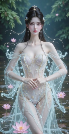 A divine celestial maiden standing gracefully in muddy swampland, ultra-detailed Eastern-style attire with moon-white silk robes adorned by intricate golden cloud patterns, flowing sleeves resembling dancing wings, pale purple sash accentuating slender waist, sacred aura glowing through swamp mist, ultra-realistic facial features with porcelain skin and starry compassionate eyes, hair styled in elegant updo with sparkling jade hairpin, loose strands framing delicate face, blooming lotus flowers with dewdrops emerging from mud, soft light beams illuminating her holy figure, cinematic fantasy atmosphere blending spiritual purity with decaying environment, Chinese mythology aesthetic, hyper-detailed textures, soft volumetric lighting, 8k resolution.