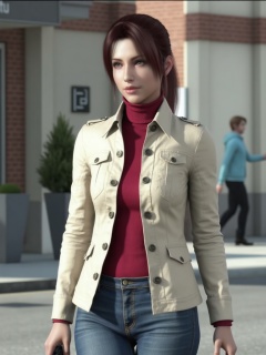 The CGI rendering of the digital image shows a young woman with fair skin,medium-length straight hair tied back,wearing a beige military-style jacket and a red turtleneck sweater. Dressed in jeans,on the street,
