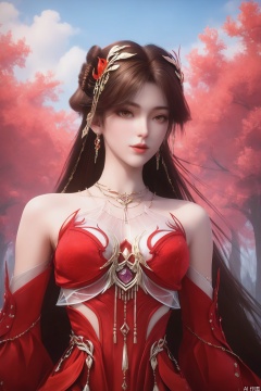 1girl, solo, long hair, brown hair, hair ornament, dress, bare shoulders, jewelry, upper body, earrings, sky, blue sky, red dress