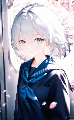 1girl, solo, school uniform, blue eyes, blue neckerchief, looking at viewer, upper body, sailor collar, serafuku, neckerchief, petals, blurry, blue sailor collar, hair between eyes, white hair, shirt, black shirt, blurry background, signature, parted lips, cherry blossoms, window, falling petals, sunlight, train interior, day, depth of field, short hair, grey hair, medium hair, closed mouth, expressionless, long sleeves