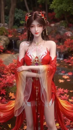 The overall outfit is dominated by red, bold and passionate, showcasing a strong personality. The combination of strapless, slit skirt and flowing sheer sleeve hem not only has a sexy element, but also exudes a dynamic and graceful vibe. The rich decorative elements, as well as accessories such as gems and metal chains, make the clothing look extremely gorgeous and full of mythological colors. Cross your arms in front of you, showing an elegant and imposing posture.
