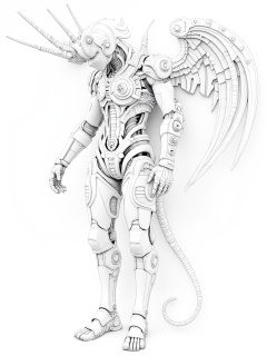 miluo_jqgk,A wickedly detailed black and white digital drawing of a futuristic, humanoid robot decked out with mechanical wings and a long, curvy tail. The bot's got a bunch of gears, pistons, and tubes all over its body, giving it a badass, mechanical vibe..<lora:米洛丨机器怪咖v1.3:1>