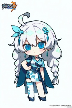 solo,(white background:1.2),simple background,kiana kaslana,chibi,manga_style,aqua,blue footwear,blue cape,high heels,bangs,hair ornament,jewelry,hair between eyes,earrings,chinese clothes,blue dress,thighhighs,white cuish,blue eyes,long white hair,twin braids